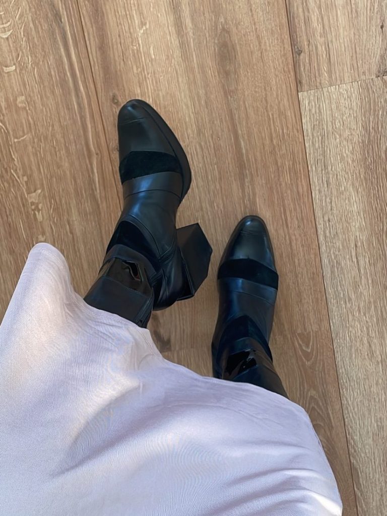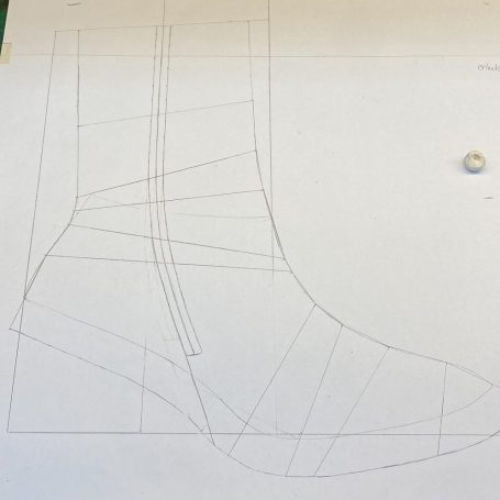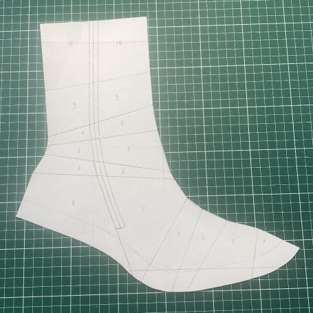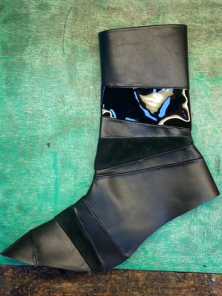 Tijdens het ontwerpen van de laarsjes wilde ik die technieken anders benaderen. Wat nou als ik die gebogen lijn die over de wreef loopt opdeel in allemaal korte rechte stukken? Dus geen draaipatroon en ook geen stiknaad over de wreef. Zo ontstonden er korte stroken die allemaal net een andere richting op gingen, maar zich wel naar de wreef van de voet vormden.