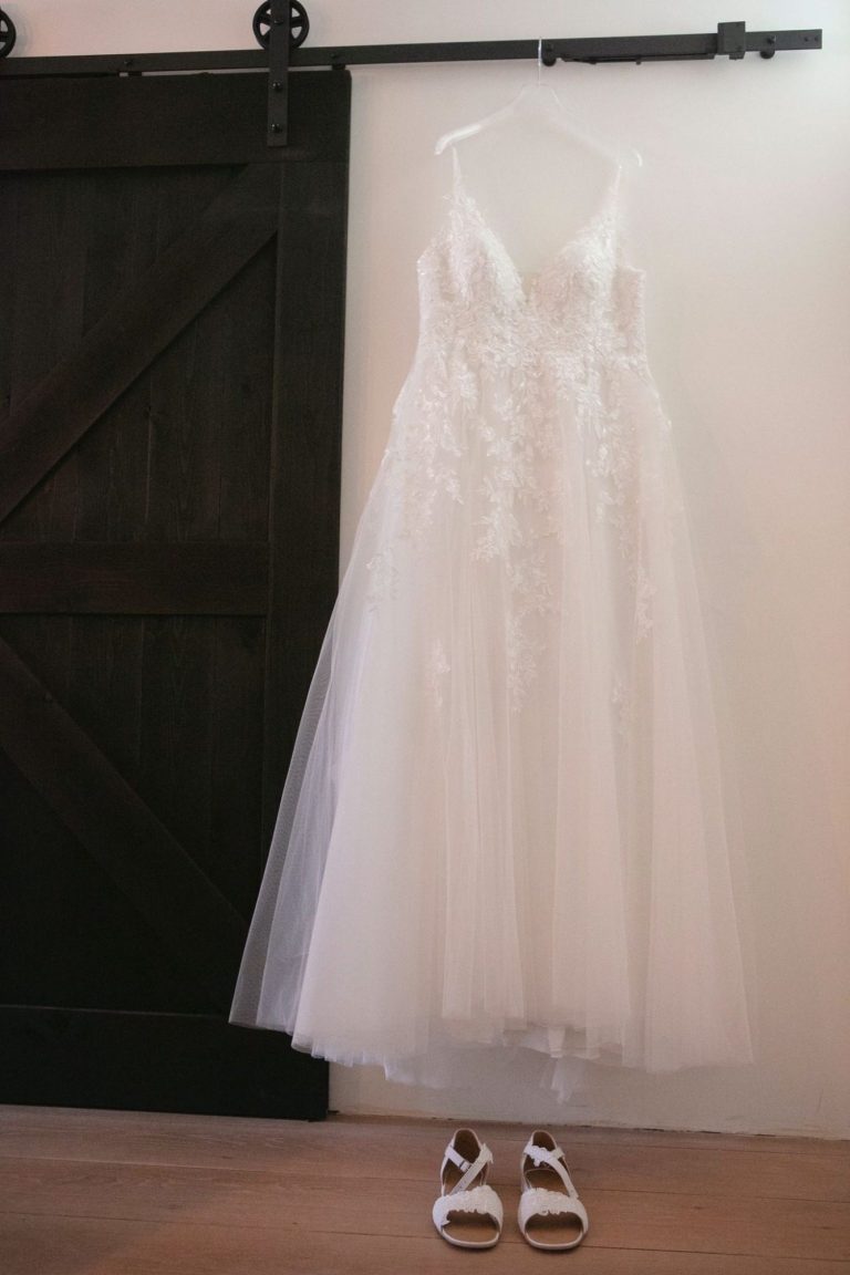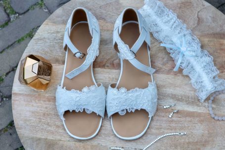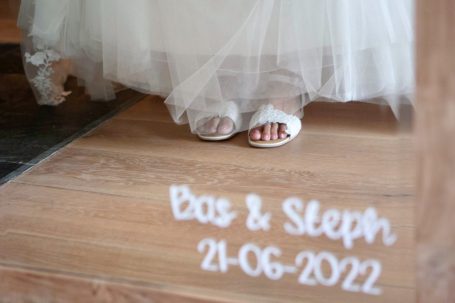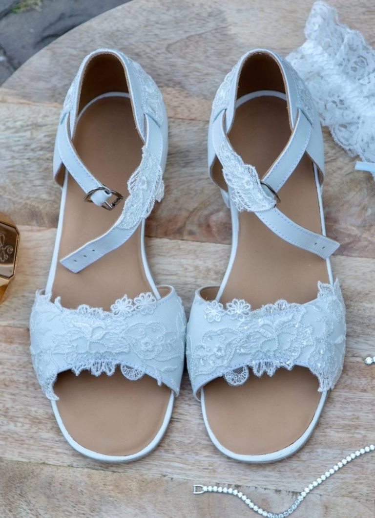 Om er zeker van te zijn dat de schoenen goed zouden passen, heb ik eerst een proefmodel gemaakt. Daarna zijn we tot een ontwerp gekomen. Ze trouwde in het wit en is een vrouw met lengte. Hierom werd gekozen een laag sandaaltje te maken van wit runderleder met daarover wit kant. Het kant was bij het op maat maken van de jurk afgeknipt. Hierdoor kwamen de details van de jurk terug in de schoenen.