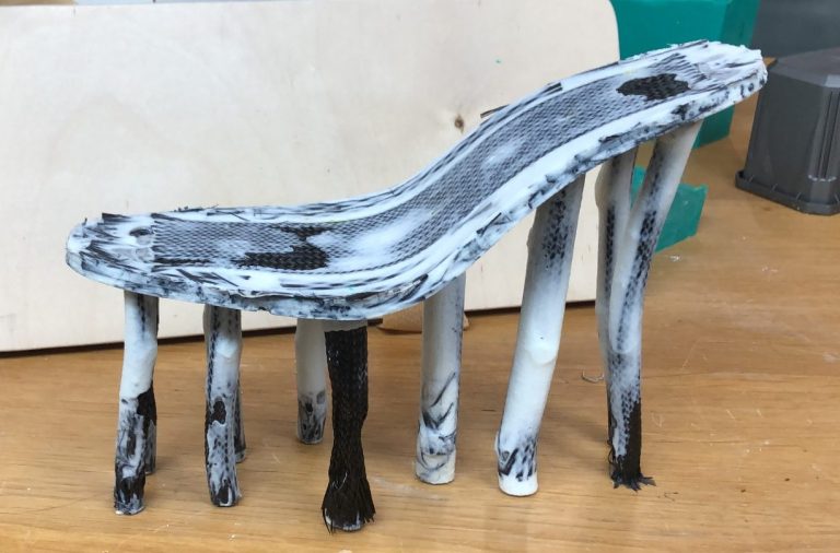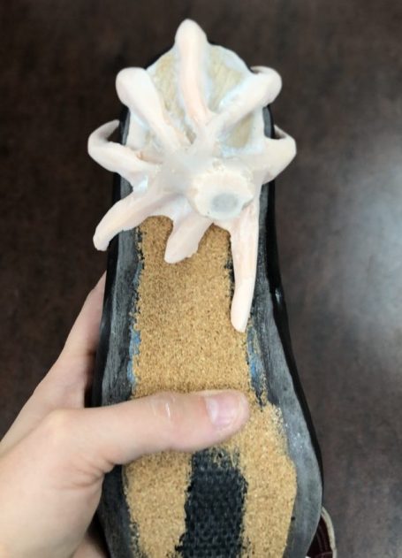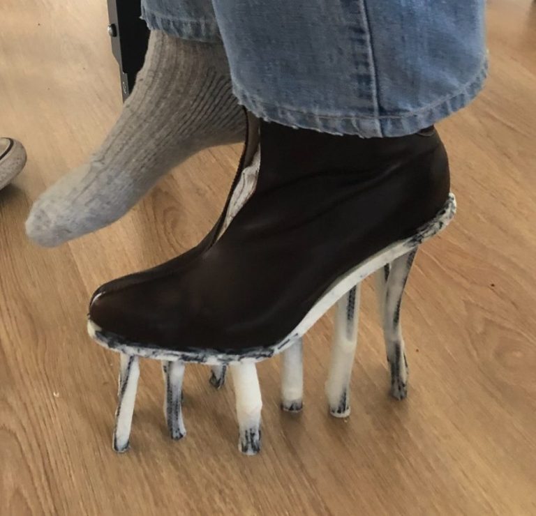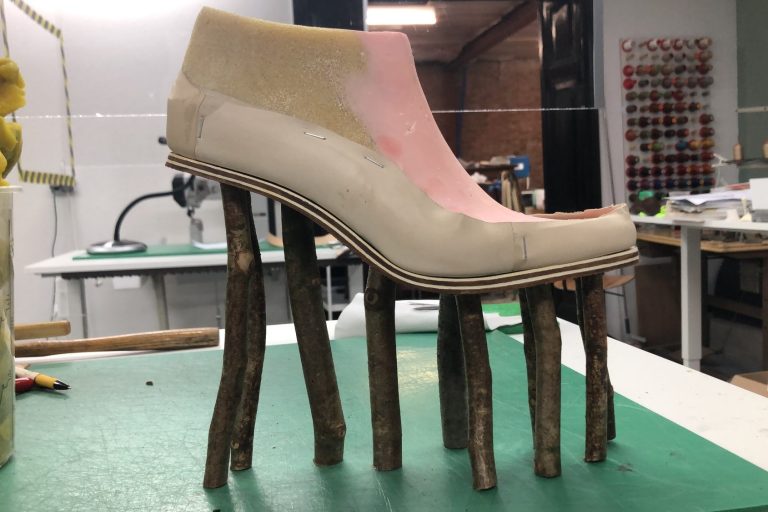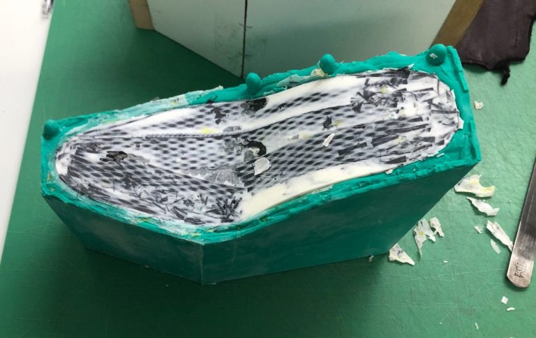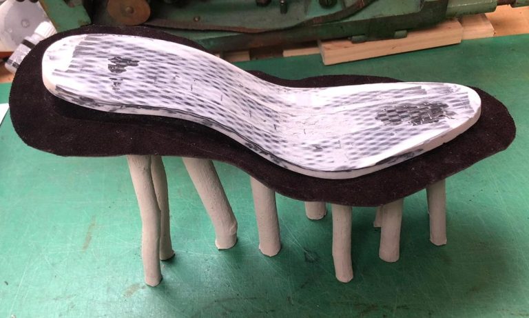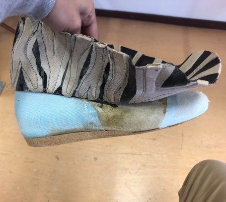 Zo startte ik met het maken van het onderwerk voor het eerste stuk van de collectie. Omdat ik wilde dat er op de schoenen gelopen kon, worden moest ik een mal maken. Deze had ik nodig om een sterke constructie te maken waar wel op gelopen kon worden.