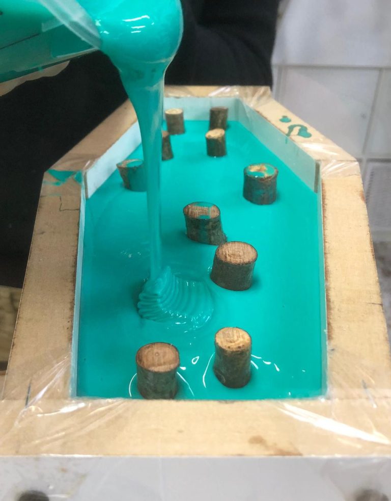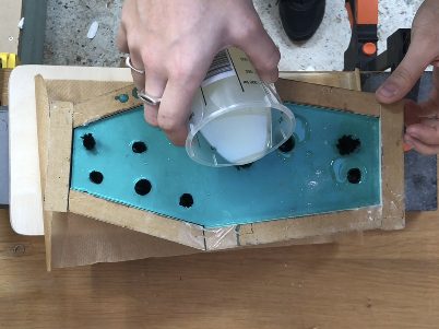 Hierna komt er twee-componenten hars in de mal. Dit maakt van de nog stofachtige carbon een harde constructie.