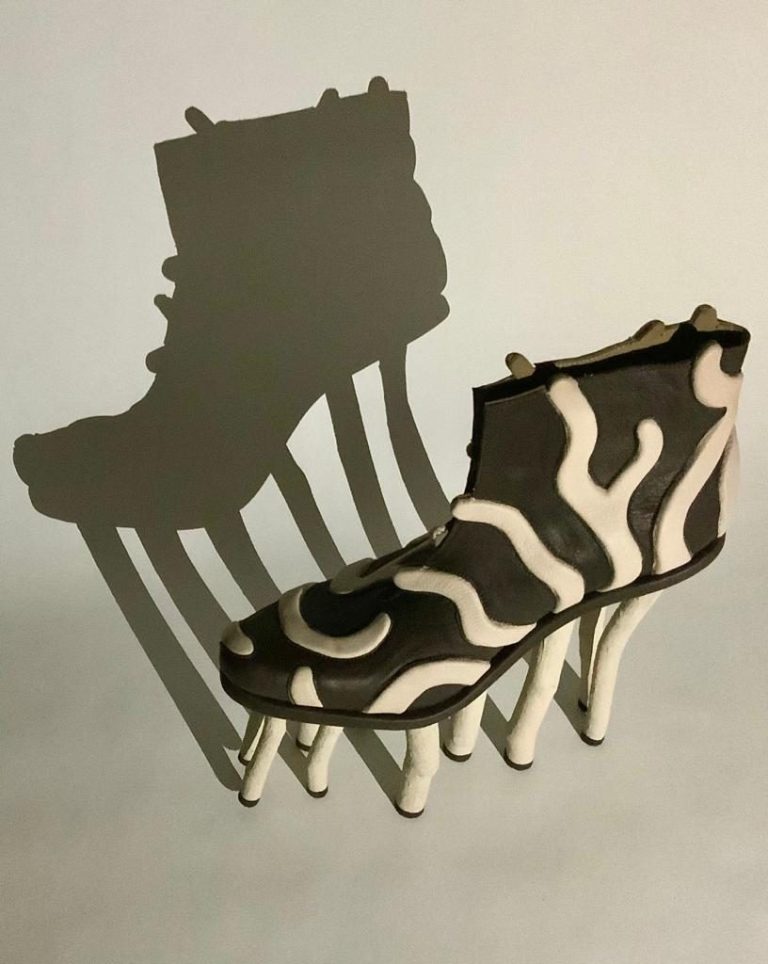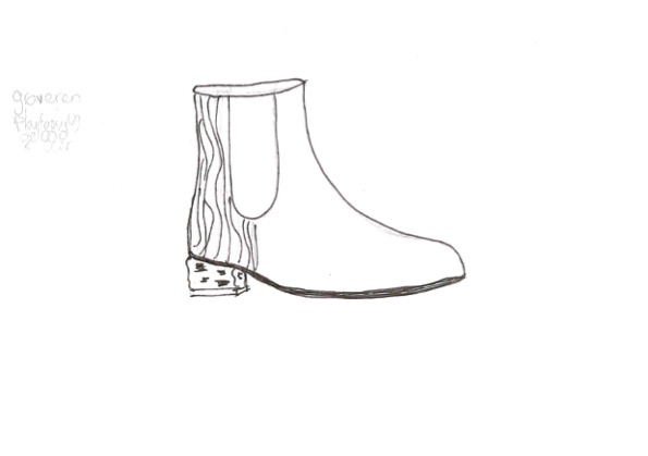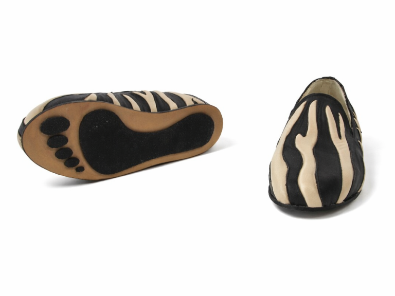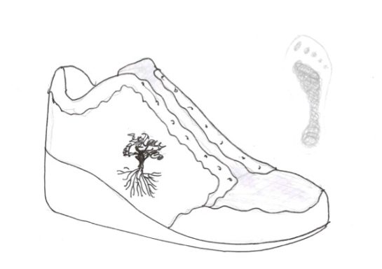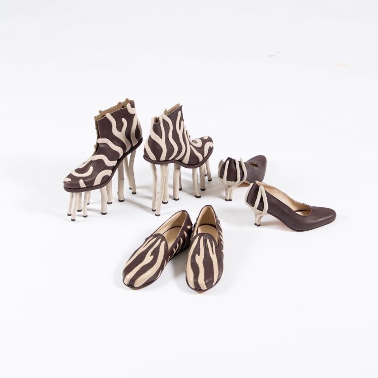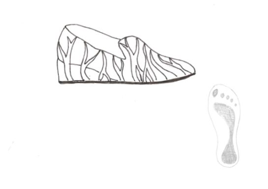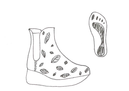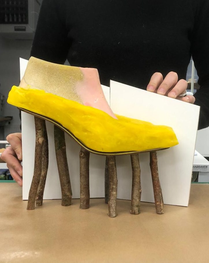 Bij dit paar heb ik meer aandacht willen geven aan de ecologische footprint die wij achterlaten op de wereld. Hoe zou ik ervoor kunnen zorgen dat we ons daar meer bewust van worden? Zo ontstond het idee om een footprint onder de zool te maken, waarmee je tijdens het dragen dus ook daadwerkelijk een afdruk achterlaat.