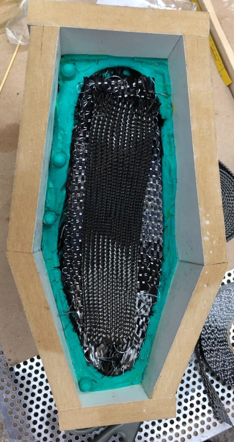 Op de plek van de stokken kwam kokergewoven carbonkous. Bij het einde haalde ik deze uit elkaar zodat het een sterke verbinding zou gaan krijgen met de zool.