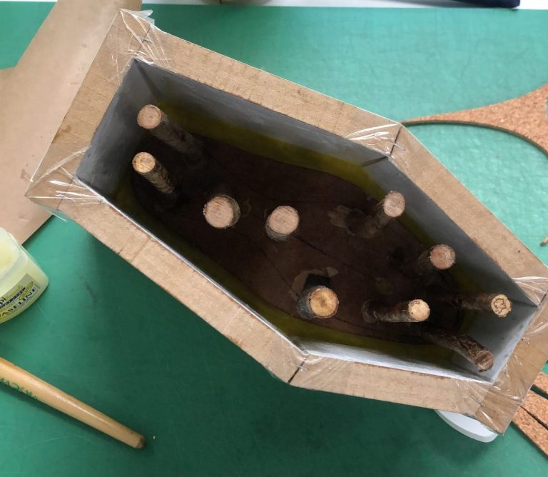 Rondom het orgineel heb ik een bak gemaakt waarin de siliconenrubber gegoten kon worden.