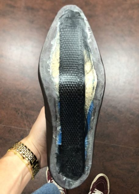 In de zool kwam vervolgens ook een carbonzoolverstijving. Het carbon is essentieel, het is het materiaal dat ervoor zorgt dat het onderwerk sterk en beloopbaar is.