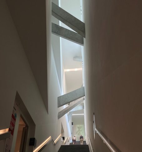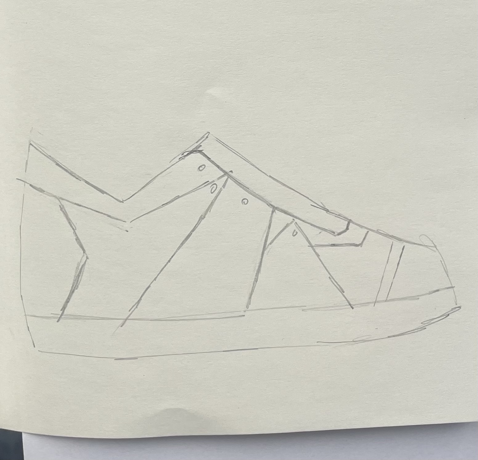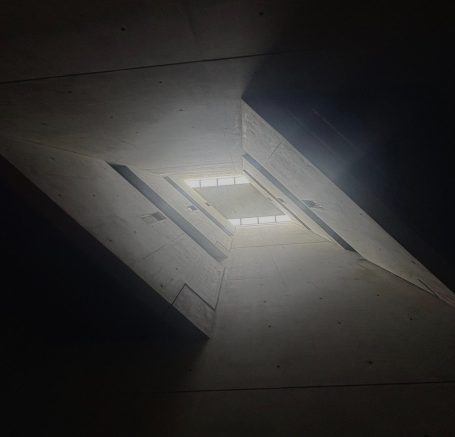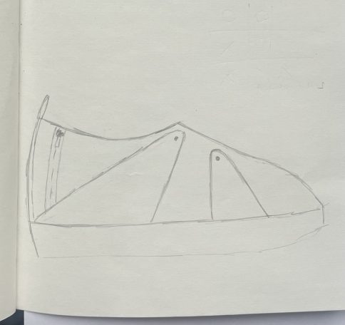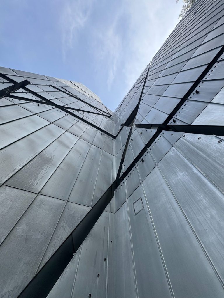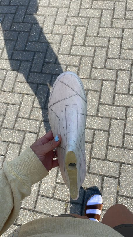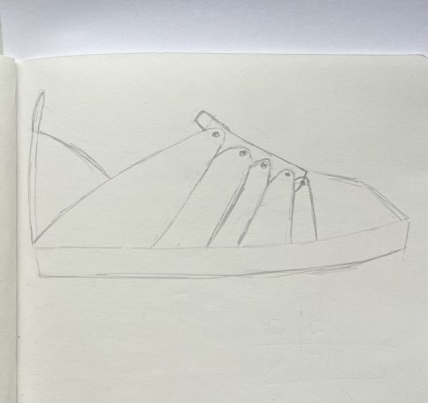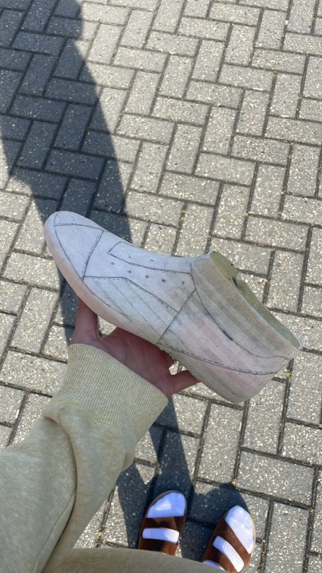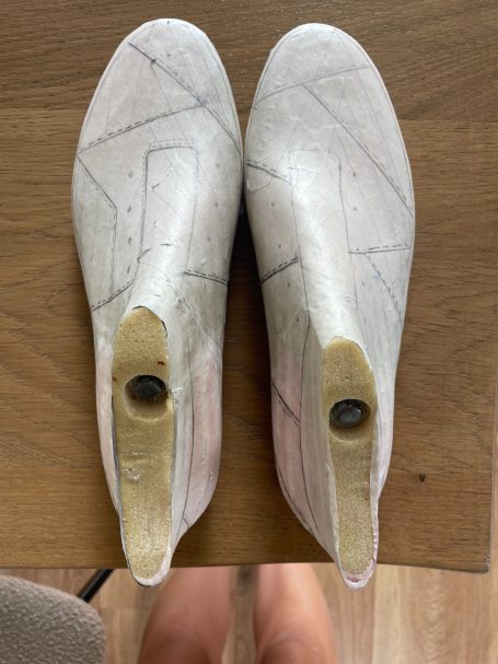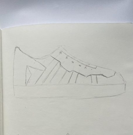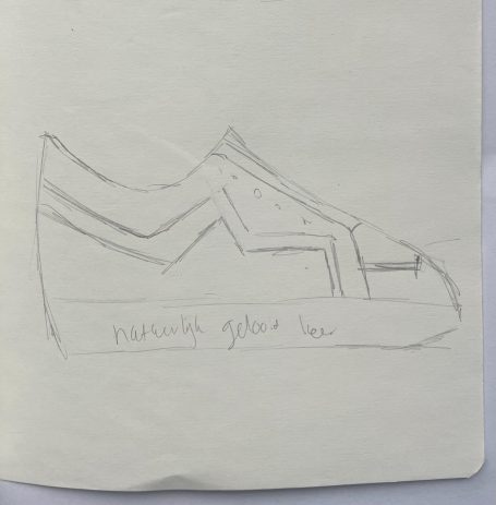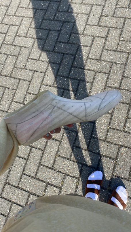In de zomer van 2025 bezocht ik het Jüdisches Museum Berlin. Dit museum vestigt zich in twee gebouwen, waarvan één ontworpen is door Daniel Libeskind. Het is een imposant en massief gebouw waarin je makkelijk verdwaald raakt. Grote lege ruimtes waar een heel klein streepje licht tussen het beton naar binnen komt. Ik voelde me, terwijl we liepen, steeds kleiner en nederiger worden. In het gebouw zit geen enkele hoek van 90° en dit liet me denken, wat als ik een schoenpatroon maak waarin ook geen hoek van 90° zit.